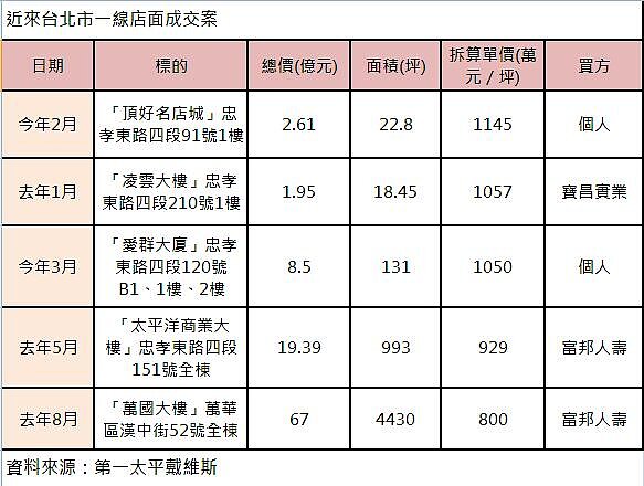 實價登錄以來,黃金地段的店面交易成為市場焦點,房仲業者分析,連續幾個東區店面成交案例,奠定忠孝東路四段單價千萬店面的市場地位,近二年 價格漲幅達四成以上。一線店面價格不斷上漲的主因,除了稀少釋出,強而穩定的租金收入是另一項關鍵,目前東區一線店面平均月租約介於每坪1.8至2.2萬 元,少數座落條件特優的黃金店面月租單價甚至高達3萬元,換算投報率約在2%至2.2%,比非主要商圈店面還高,加上今年開春以來,零售商拓點需求甦醒, 一線店面卡位戰一觸即發。
