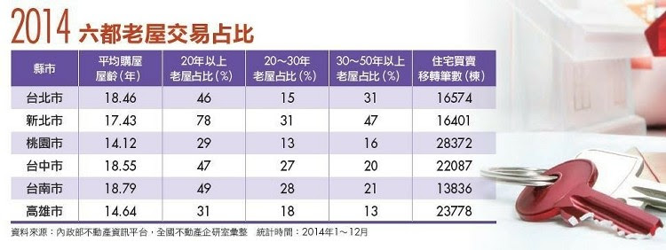 據內政部統計,台灣房屋平均屋齡為二十七‧六五年,屋齡二十年以上老屋占比高達八成,新北市老屋占比為七十八%,居全國之冠,台北市平均屋齡三十‧七七年,為全台住宅屋齡最高縣市。