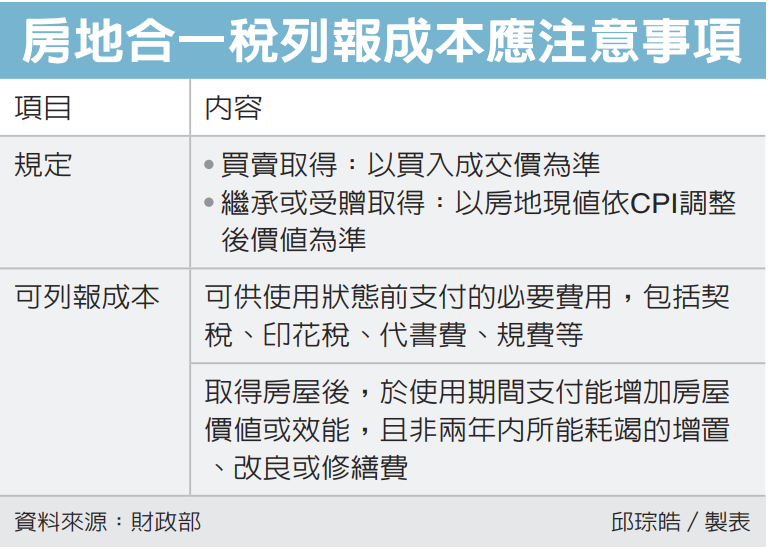 國稅局提醒,民眾報繳房地合一稅時,依規定可列報成本包括可供使用狀態前支付的必要費用,如契稅、印花稅、代書費、規費、公證費、仲介費等,以及房地所有權移轉登記前之借款利息,或取得房屋後,於使用期間支付能增加房屋價值或效能且非兩年內所能耗竭之增置、改良或修繕費。