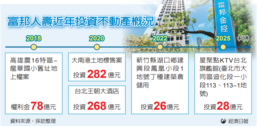 富邦金控旗下子公司富邦人壽昨日以總價28億元購入台北市大同區迪化段一小段113、113-1地號,該地為「星聚點 KTV台北旗艦館」,並由星聚點壹號文創公司回租全棟。