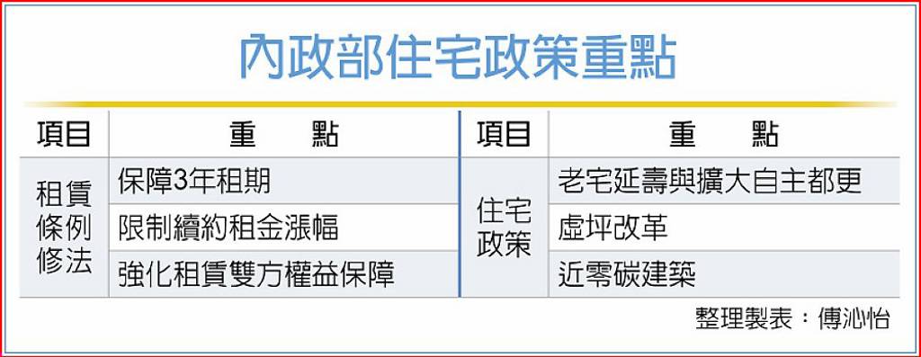 至於「限制續約租金漲幅」部分,內政部表示,為避免租客因不合理漲租被迫搬遷,修法規範房東續約雖可調漲租金,但須於租期屆滿六個月前通知,且漲幅不得超過當月行政院主計總處公布的房租指數年增率,確保租金調整合理。