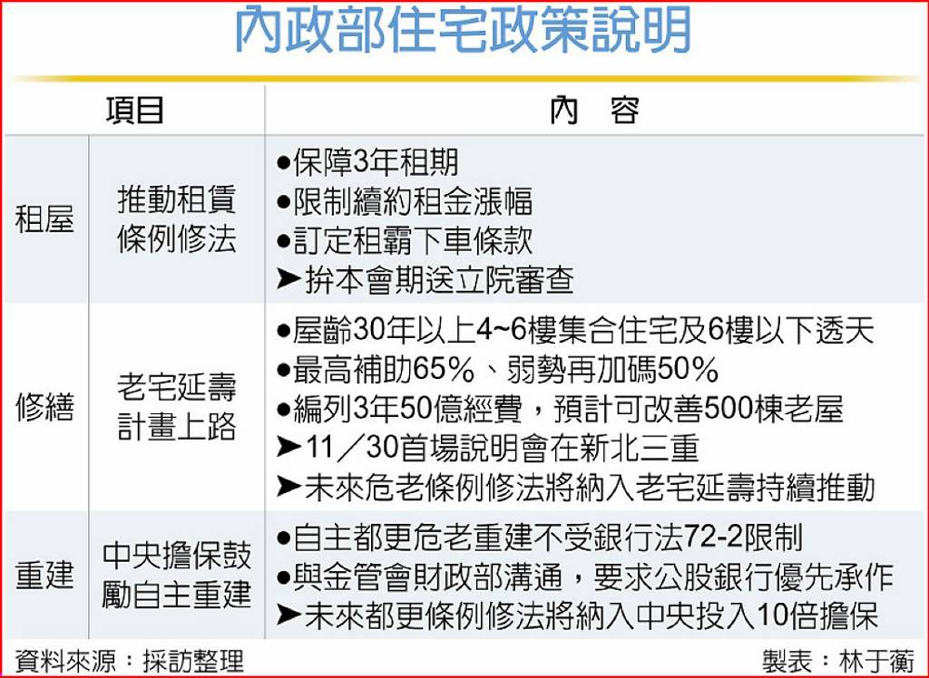 內政部擬修正《租賃條例》,主要內容包括保障3年租期、限制租金漲幅,增訂租霸下車條款等。對此立委質疑限制租金漲幅,可能抑制房東出租意願,或變相讓房東先行漲租;內政部次長董建宏26日在立院表示,方向是在3年租期內的續約租金與CPI連動,每年漲幅不能超過CPI漲幅,望本會期提出草案送查。