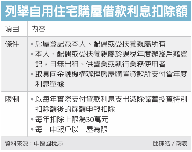 財政部中區國稅局表示,民眾符合條件,可在申報綜所稅時列舉扣除購屋借款利息,不過要留意三大限制,包含每年扣除金額上限30萬元、應扣除儲蓄投資特別扣除額、每戶以一屋為限。