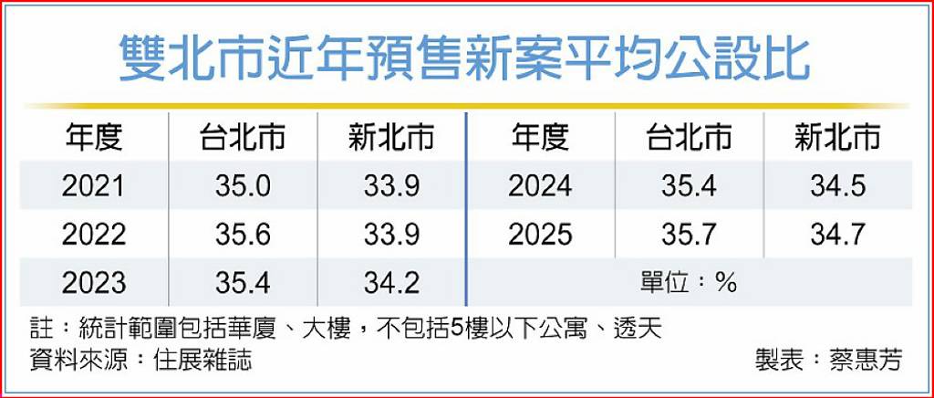 據住展統計,2025年新成屋、預售屋建案平均公設比,雖與前幾年的差距不大,仍為統計紀錄以來高點。其中台北市公設比達40%以上的預售新案,占比更來到1成,比2024年的5%翻倍。