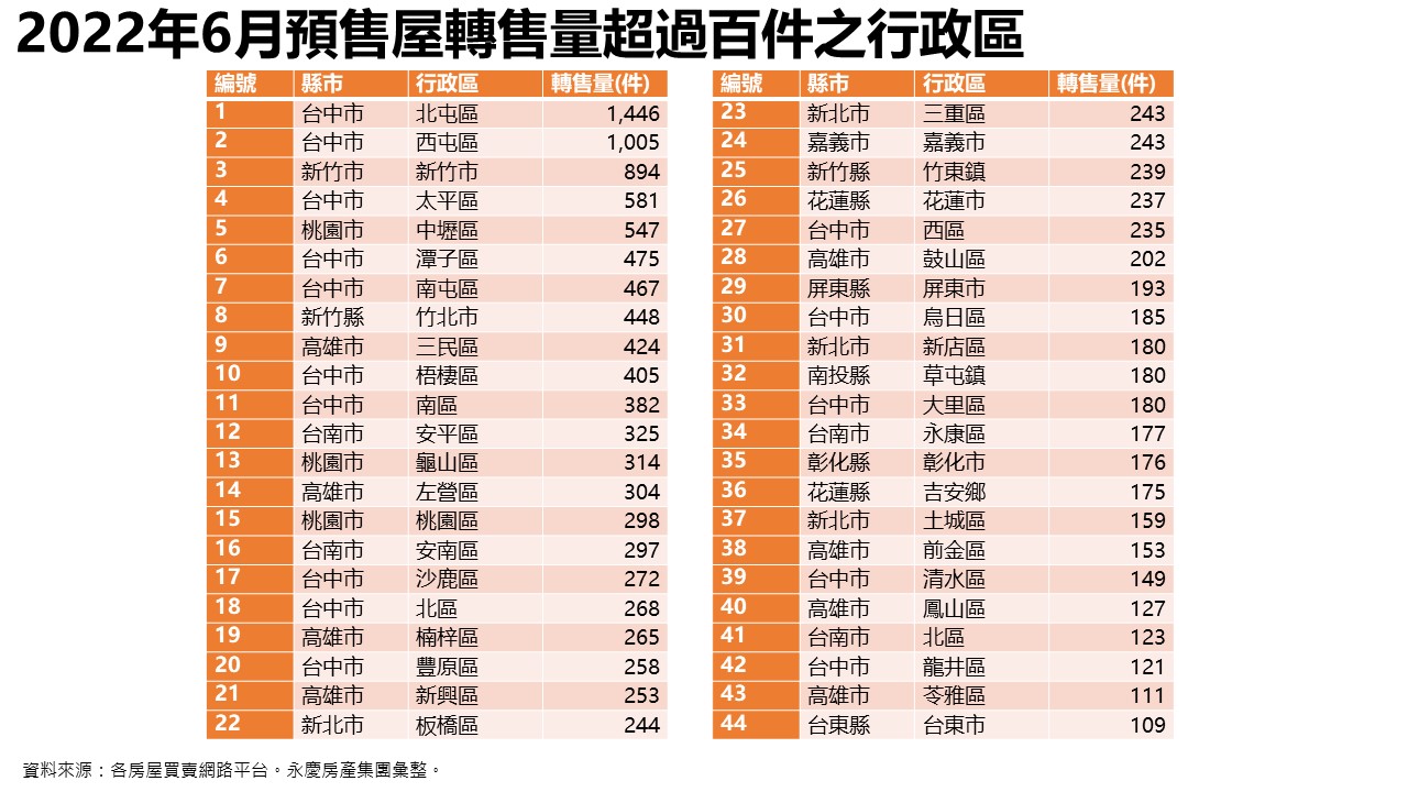 進一步觀察預售屋轉售量多的行政區,台中市北屯和西屯兩區的預售屋轉售量,分別為1446件和1005件,為全台最多,上述兩區域面積總和只占0.3%台灣總面積的行政區,預售屋轉售量就佔全台的12%。