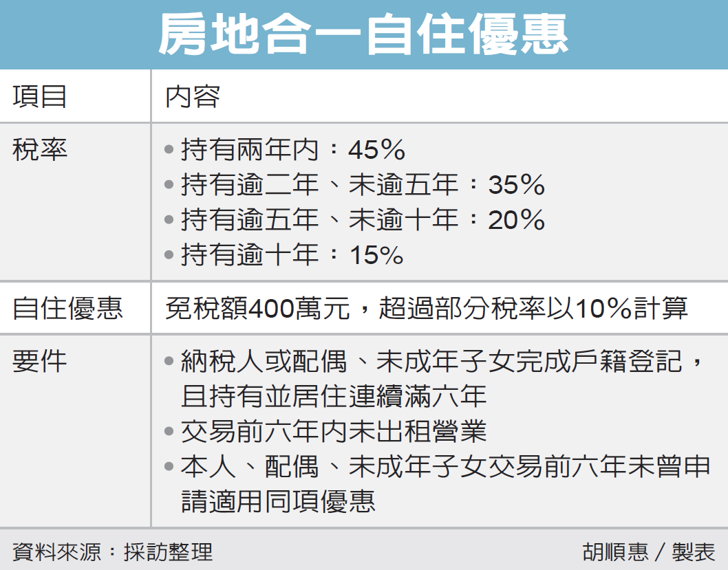 台北國稅局表示,《所得稅法》規定,出售2016年元旦後取得房地,符合三大條件可適用自住優惠,包括第一,納稅人本人或配偶、未成年子女辦理完成戶籍登記,且持有並居住在該房屋連續滿六年;第二,交易前六年內並未出租、供營業或執行業務使用;第三,本人、配偶、未成年子女交易前六年未曾申請適用房地合一自住優惠稅率。