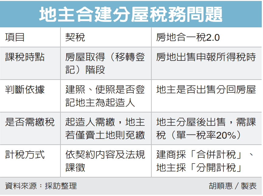 但要特別注意的是,若地主也掛名為起造人,或實際銷售自己分得的房屋,則會被視為房屋的原始移轉人,需負擔契稅申報義務,因此,地主在簽約前就應確認自己在建照及使用執照上的身分,避免誤以為只賣自己分得的房子就不用課稅。