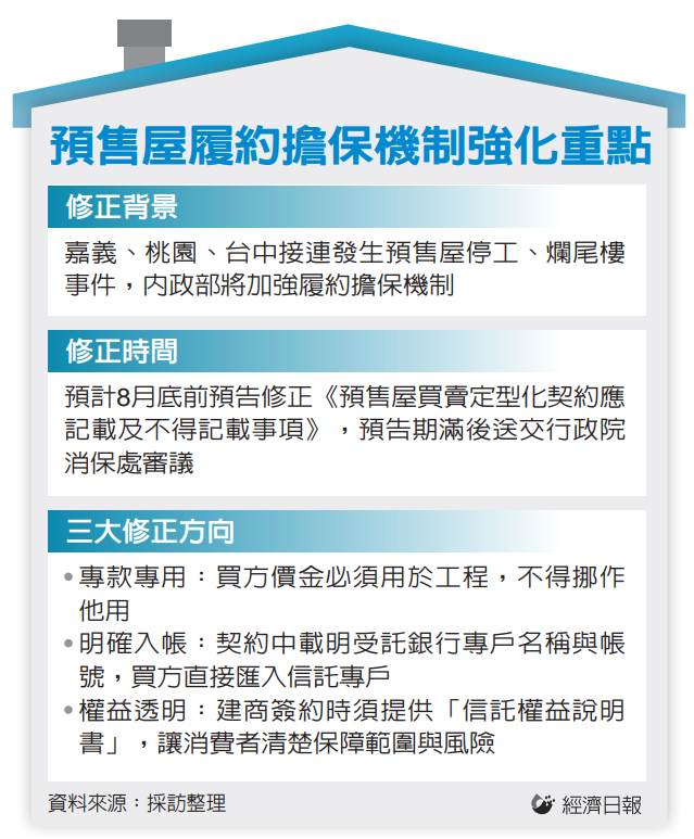 為強化預售屋履約擔保機制,地政司司長林家正表示,預售屋買賣定型化契約修正重點將集中在三大方向,包括第一,買方所繳價金應專款專用於興建工程項目,避免工程未動工或興建初期,買方所繳價金即被用罄;第二,買賣契約應載明受託機構之信託專戶名稱及帳號,讓買方可將購屋款項直接匯入信託專戶,避免遭建商私自挪用;第三,簽約時應提供信託權益說明書,讓民眾充分了解建商提供的履約擔保機制及權益保障內容,並提醒其簽約前應審慎評估風險。