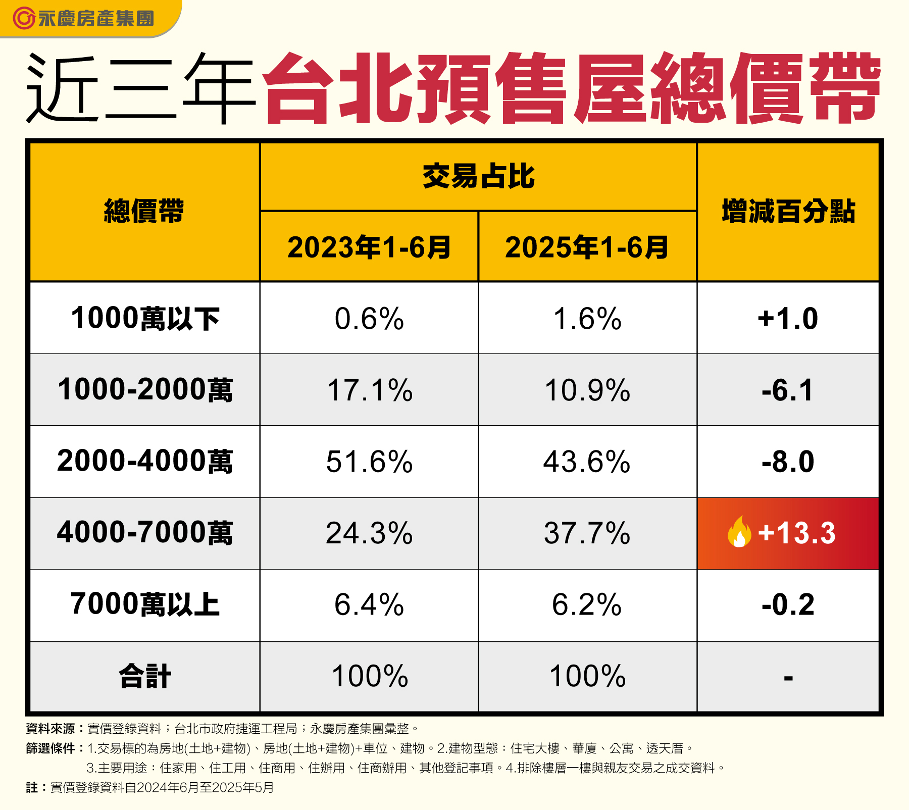 觀察台北市2025年1-6月預售市場交易,總價4000 -7000萬元的交易占比37.7%,交易占比將近四成。與2023年同期相比,增加13.3個百分點。