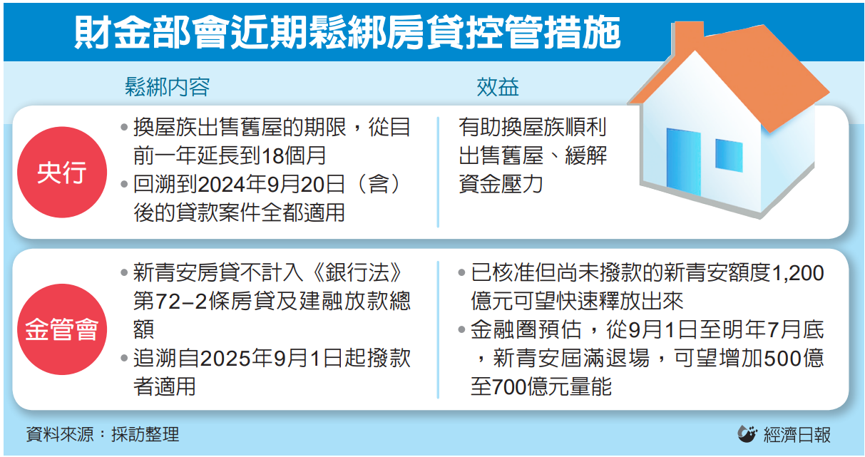 行政院長卓榮泰希望銀行房貸「水龍頭開大一點」,財金部會動起來,央行昨(8)日宣布換屋族出售舊屋的期限,從目前一年延長到18個月,並回溯到2024年9月20日(含)後的貸款案件全都適用,銀行界認為,此舉有助換屋族順利出售舊屋、緩解資金壓力。