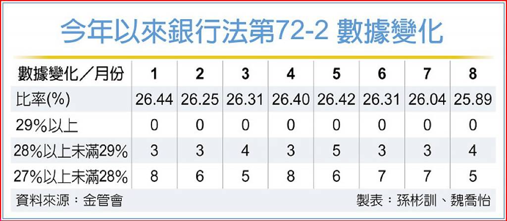銀行局副局長張嘉魁分析,比率下滑主要是計算公式的分母:存款總餘額加金融債券發售額,增至8月59.56兆元,月增0.57兆元;計算的分子:住宅建築及企業建築放款總餘額,雖增至8月15.42兆元,僅月增0.06兆元,反映在銀行法72-2比率下滑。