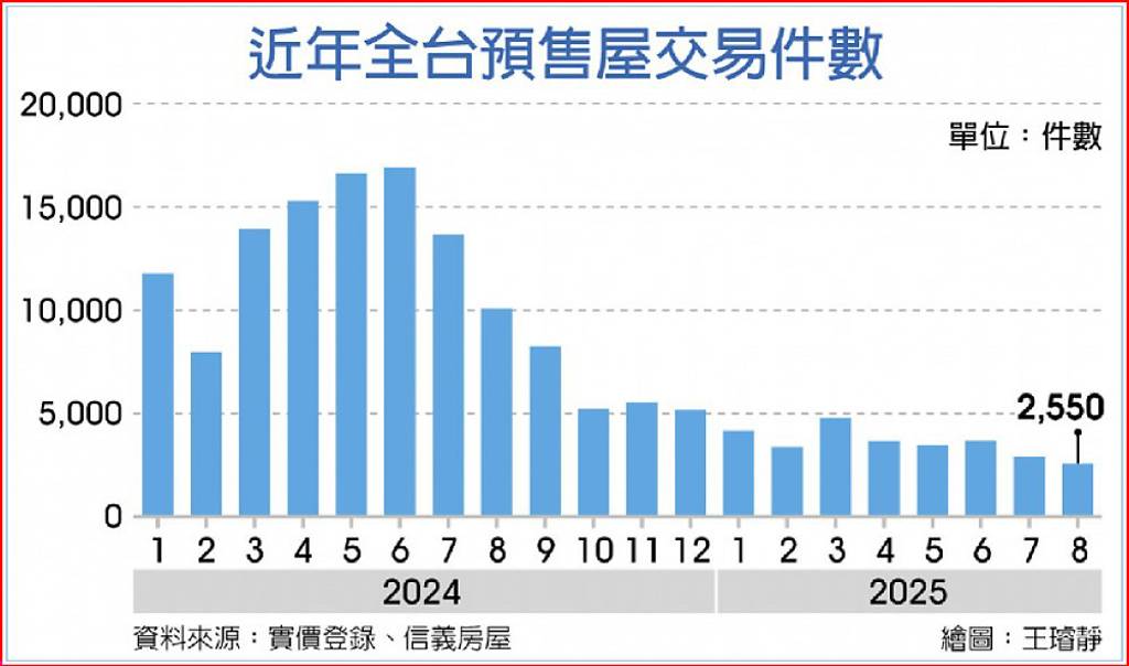 實價登錄統計顯示,去年房市景氣熱絡的5、6月間,預售屋單月交易量可達1.6萬件,隨著去年9月央行推出第七波信用管制後,市場信心轉趨保守,預售屋交易量快速降溫,去年9月跌破1萬件,今年前八個月僅有1月及3月單月超過4,000件,今年平均月均量僅3,565件,是景氣熱絡時期的3成不到,預售市場幾乎全面陷入死寂。