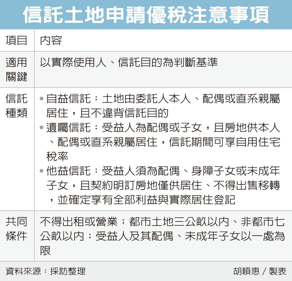 土地若為信託財產,仍可有條件享有自用住宅用地稅率。稅務局表示,依規定,只要符合條件,不論是自益信託、遺囑信託或他益信託等類型,都可申請比照一般自住房地,以較低稅率課徵地價稅。