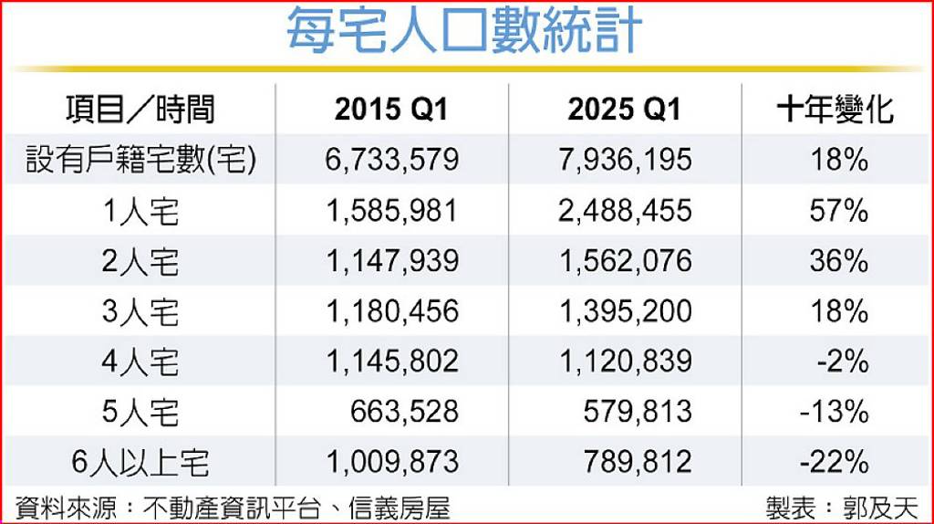 不動產資訊平台資料顯示,一人宅數量從十年前的158.6萬宅,增加到今年第一季的248.8萬宅,十年間增加57%;二人及三人宅數量十年來也分別增加36%、18%,不過四人、五人宅則分別減少2%、13%,六人之上住宅更大減22%,顯示住宅及家庭結構往精簡傾斜。