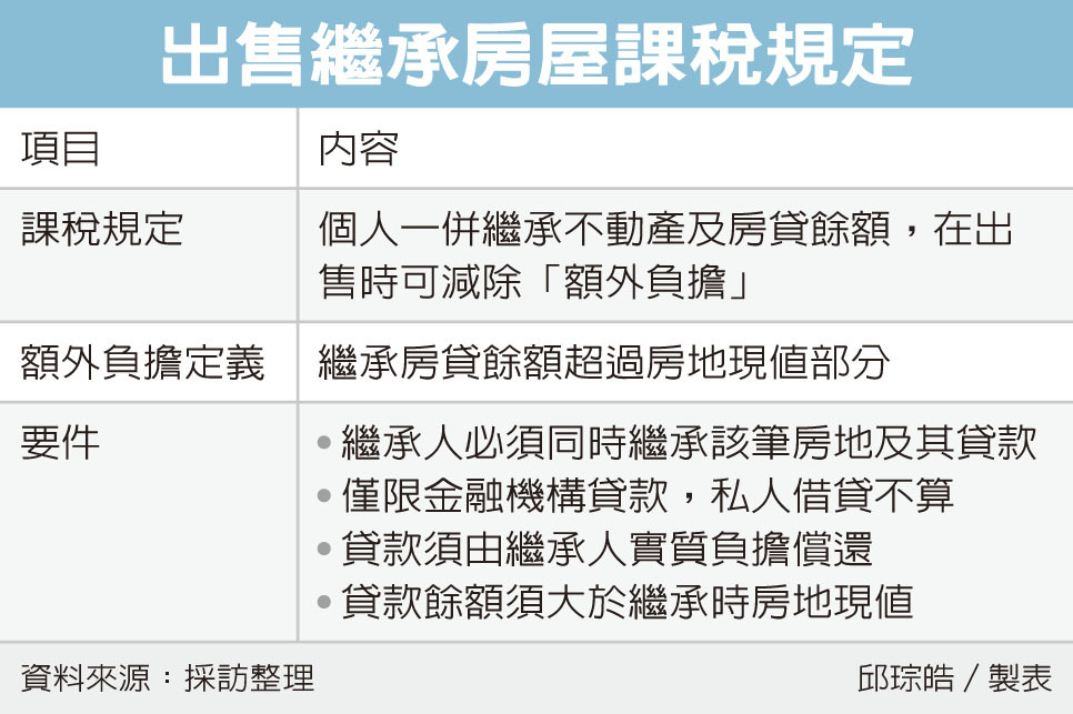 財政部台北國稅局表示,個人繼承不動產,若併同繼承所遺留的房貸餘額,在將這筆房地出售時,貸款餘額超過繼承時的房地現值、且確實由個人實際負擔償還部分,視為「額外負擔」,可自房地交易所得中減除,減輕房地合一稅負擔。