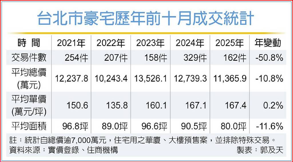 據實價登錄統計顯示,今年前十月台北市總價逾7,000萬元的預售豪宅共有162件交易,年減50.8%;平均總價約1.1億元,較去年同期修正約10.8%;豪宅平均單價在經過2022至2024年的急漲後,上漲動能趨緩,今年平均單價每坪167萬元,與去年相較波動不大;至於平均面積僅80坪,較過去多在90坪以上、甚至逼近百坪,不僅面積為近年來最小,更比過去縮水10~20坪。