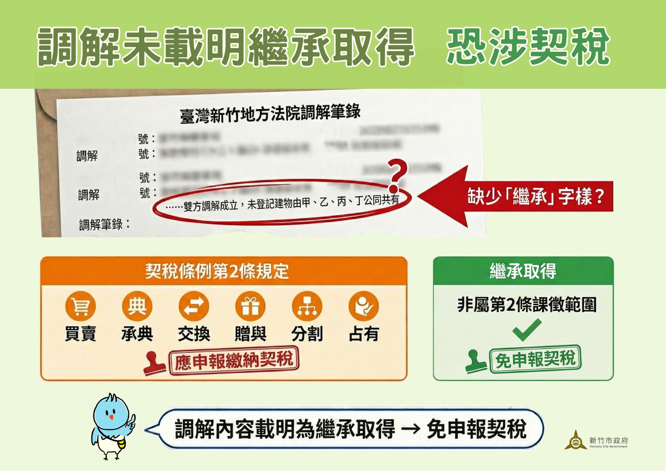 因調解筆錄內容依法不得任意補充,為協助民眾解決難題,新竹市稅務局主動發文向法院查證調解內容之形成原因,經法院回覆該共同共有關係確屬因繼承所產生後,得以依法認定免徵契稅,並順利完成房屋稅納稅義務人名義變更。