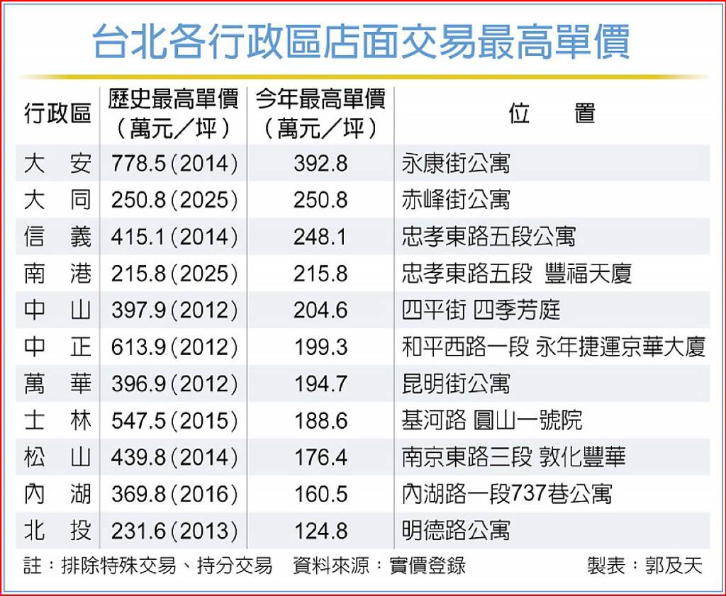 對比於近年住宅市場熱絡,即使遇打炒房政策逆風,但價格普遍攀上新高;店面市場則是處於「失落十年」,台北市12個行政區今年交易單價最高的「店王」,除大安區永康街店面最高達每坪392.8萬元外,其餘也僅大同、信義、南港、中山等四區站上每坪200萬元,與10~12年前店面最熱時所創的最高單價相較,甚至有一半行政區未及過往天花板的一半。