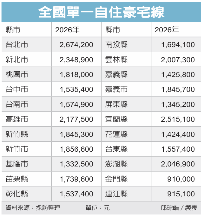 各縣市去年首次公布標準後,今年已全數公布明年標準。台北市明年期房屋稅單一自住豪宅線為267萬4,200元,也就是說,房屋現值超過此金額,將視為豪宅,不能適用1%稅率。