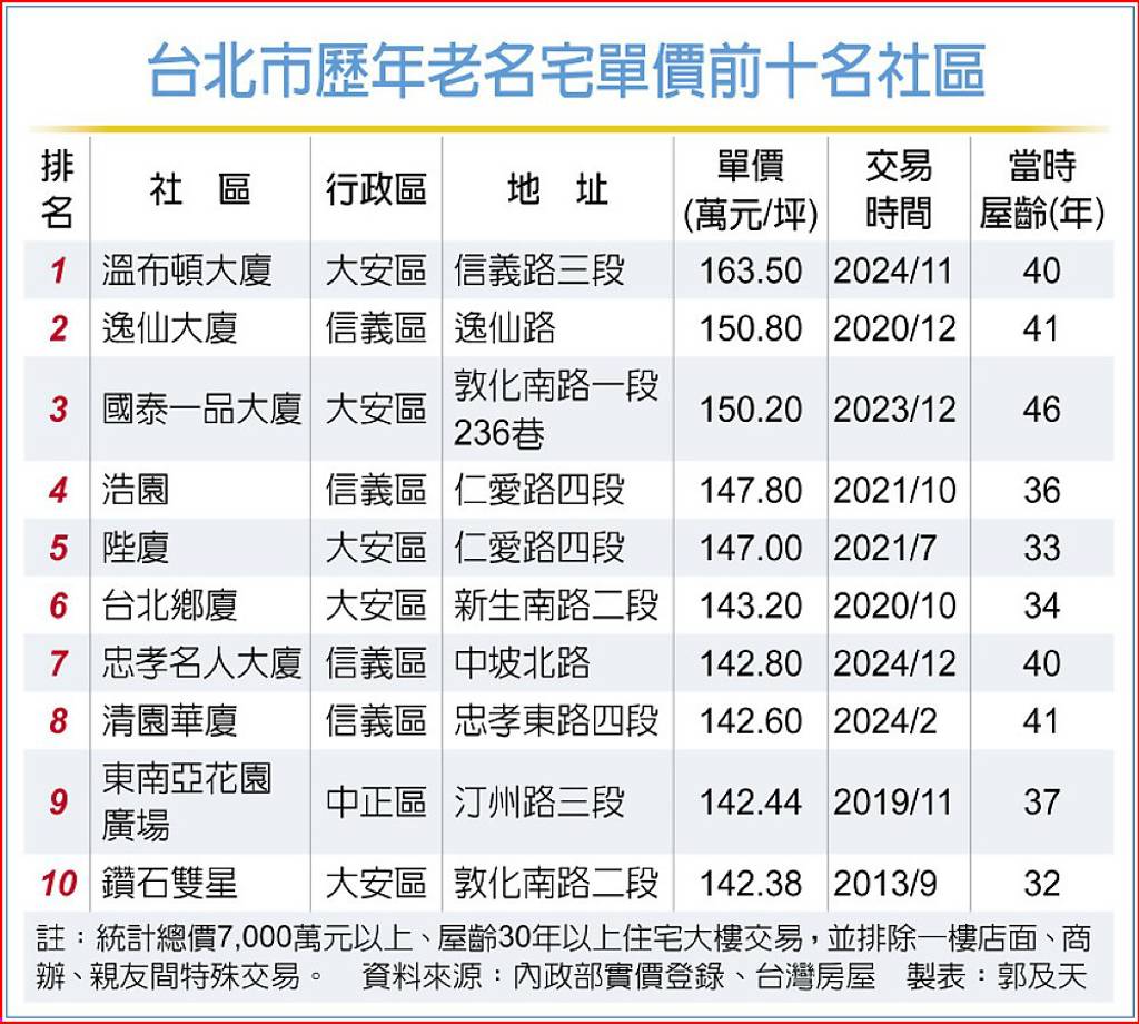 據統計,歷年來成交時屋齡已達30年的十大老名宅,包括「溫布頓大廈」、「逸仙」、「國泰一品大廈」等,最高成交單價都達到每坪150萬元以上,去年包括「忠孝名人大廈」、「清園華廈」等名宅去年也都出現逾每坪140萬元的高價。