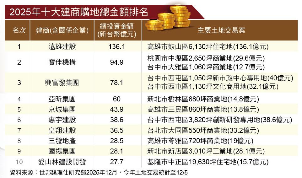 根據統計,2025年十大建商購地總額合計超過560億元,其中交易金額明顯集中於前五名,遠雄建設以約136.1億元居榜首,主要來自高雄市鼓山區6,130坪住宅用地交易;排名第2的寶佳機構,全年購地金額約94.9億元,交易標的涵蓋桃園中壢與台中大雅等商業用地;興富發集團則以約78.1億元位居第3,購地區位集中於台中西屯區;第4名亞昕集團全年購地金額約60億元,主要交易位於新北市樹林區商業用地。