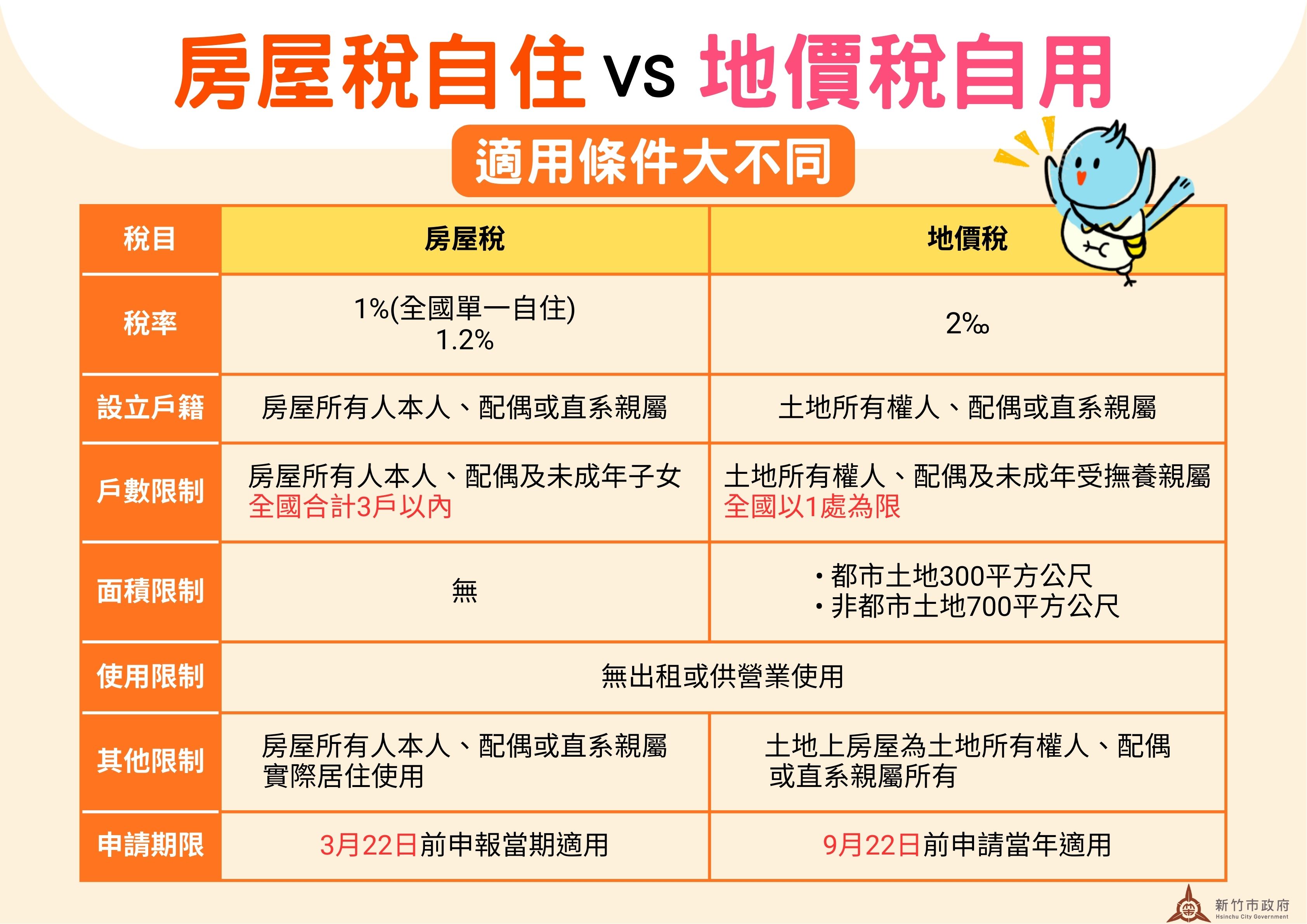 房屋稅2.0新制上路後,許多民眾誤以為自住房屋只要有設立戶籍、沒有出租或營業,就可以同時享有房屋稅與地價稅自住優惠。新竹市稅務局提醒,兩者在戶數限制、面積、申請期限及適用要件上仍有差異,必須分別提出申請並經審查核准後,才能適用。