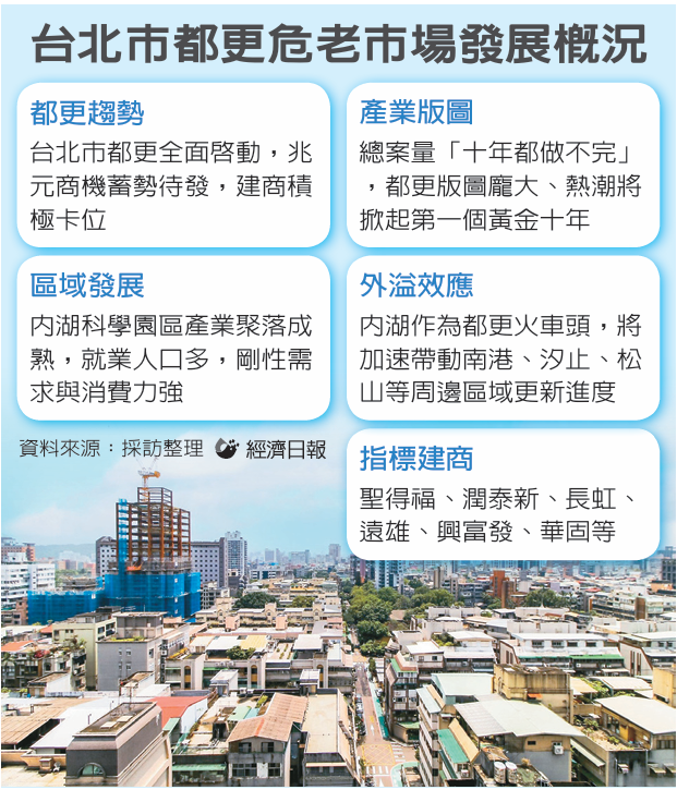 台北市都更潮今年啟動,兆元商機蓄勢待發,各大建商積極卡位。有建商表示,台北市危老案量龐大,即使建商都跳進來做,未來十年也做不完,今年起以內湖地區率先開跑,將成為北市都更示範行政區與火車頭,帶動都更黃金十年。