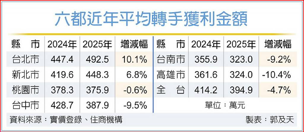 房市轉冷、房價下修,轉售房屋的平均獲利也跟著縮水,相較於2024年轉售房屋平均每件獲利414.2萬元,2025年減少至394.9萬元,年減4.7%;轉售獲利呈現「南冷北熱」情況,台中、台南、高雄平均每件獲利減少約1成,雙北轉售獲利仍逆勢成長。