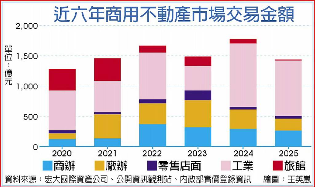 工業地產受惠於由於AI半導體產業快速成長,已連二年交易金額突破900億元,宏大國際資產預估,隨著美台關稅底定,2026年工業地產市場將挑戰1,000億元大關。