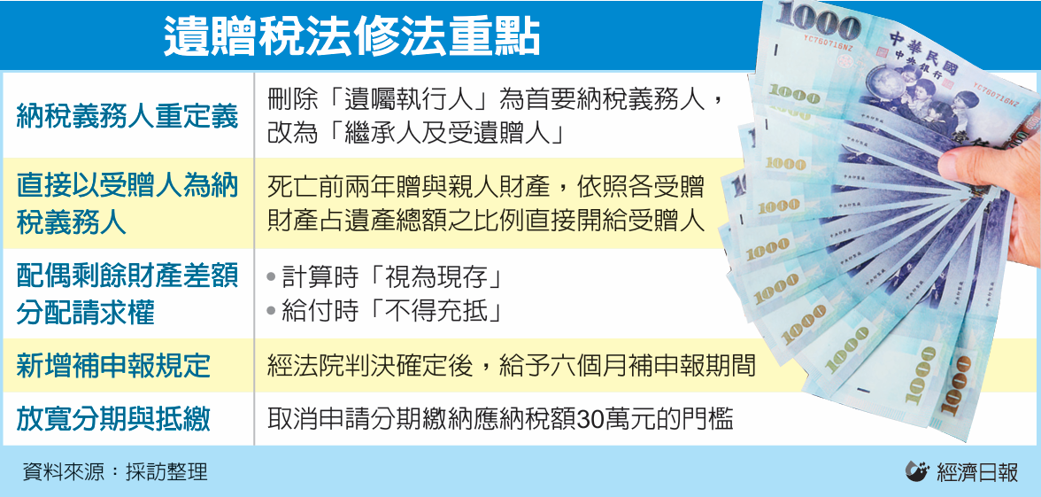 為解決「大老婆的復仇」,並符合憲法判決意旨,財政部昨(22)日預告《遺產及贈與稅法》修法草案,最大變革在於未來上路後,死亡前兩年贈與財產,納入遺產總額計算後,贈與部分只能對受贈人課遺產稅,就算拋棄繼承也逃不掉這一筆遺產稅。