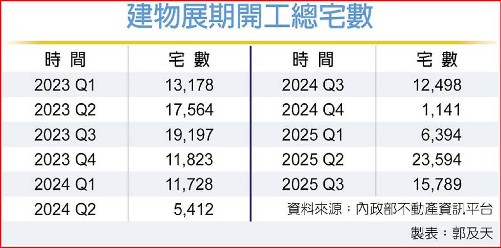 房市清淡,2025年第二與第三季建物展期開工申報數量,分別攀升到2.4萬與1.6萬戶,較先前景氣交易熱絡時單季不到萬戶,展期開工數量明顯增加,為疫後缺工潮後的另一波高峰。至於今年初爆發土方之亂,則後續需觀察展延開工狀況是否持續攀升。