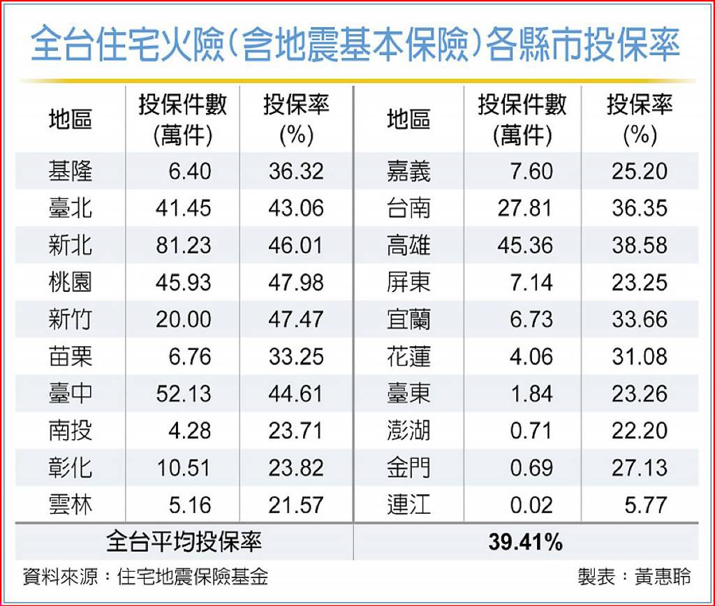 產險業分析,六都投保率偏高,主要與房貸帶動效應密切相關。銀行在辦理房屋貸款時,通常會要求借款人搭配投保住宅地震險,確保抵押擔保品的基本風險控管,使新成屋、集合住宅與高房貸比率地區的投保率相對提升。然而,在自有住宅比例高、屋齡偏高的地區,缺乏投保誘因,加上部分民眾對地震險理賠條件理解有限,投保意願自然偏低。