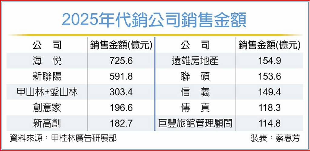 甲桂林廣告研展部協理李尚華分析,代銷業走向「大者恆大」格局。據內政部資料,去年代銷業銷售額前五名的海悅、新聯陽、甲山林和愛山林、創意家、新高創,全年銷售總額達2,000億元,包辦前十強銷售總額的74%,前三強銷售總額1,620.8億元,更拿下前十強6成銷售份額。