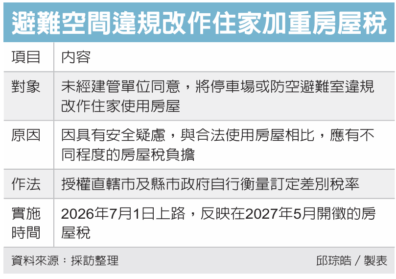 財政部昨(26)日預告修正「囤房稅2.0」相關子法,針對未經建管單位核准,逕自將停車場或防空避難室改作住家使用的房屋,授權地方政府可加重其房屋稅率,法定稅率最高4.8%,新規預計今年7月1日上路,反映在明年5月開徵的房屋稅。