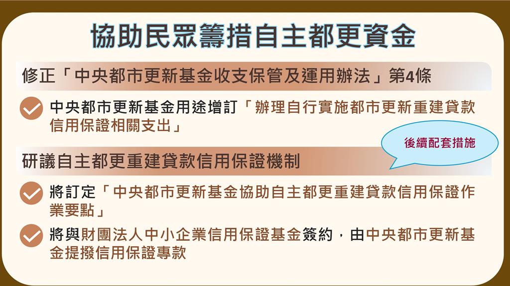 蔡長展指出,為協助民眾自行實施都市更新,內政部透過修正辦法,將自行實施都市更新重建貸款,納入中央都市更新基金信用保證用途之一。後續除將訂定相關作業要點,也會與中小企業信用保證基金簽約,由中央都更基金提撥信用保證專款。