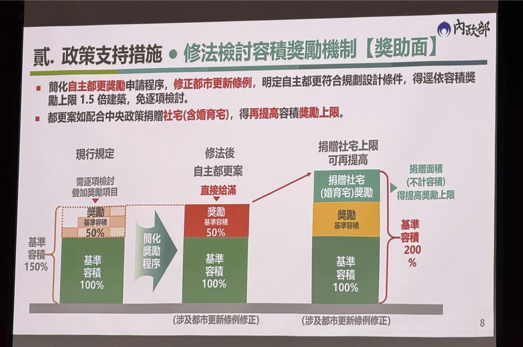國土署官員說明,為擴大鼓勵自主都更,內政部在這次《都市更新條例》修法檢討「容積獎勵」機制,初步規劃簡化自主都更申請容積獎勵程序,將自主都更案的容積獎勵方案改為「符合條件、一次給滿」,直接給到上限值1.5倍容積獎勵,取代過去逐項疊加的程序。此外,若一般案件或自主都更案申請達1.5倍上限後,願意配合中央社會住宅政策捐贈社宅或婚育宅,還可額外疊加,最高不超過基準容積的200%。