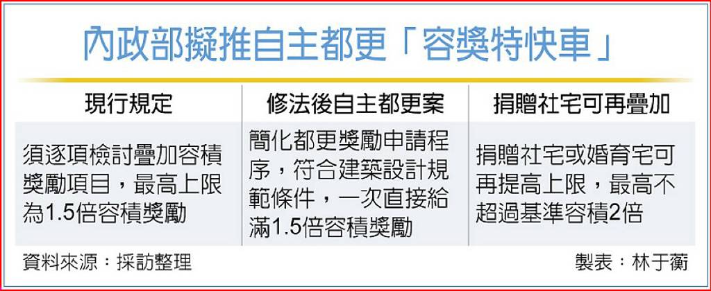 內政部30日舉辦「都更條例部分條文修正案相關機關研商會議暨公聽會」。為擴大自主都更,內政部修法簡化自主都更獎勵申請程序,透過修正《都市更新條例》,擬訂定自主都更「容獎特快車」,只要符合規劃設計條件,得直接依照容積獎勵上限1.5倍建築容獎;此外,都更案若捐贈社宅或婚育宅,則可再疊加容獎上限,最高不超過基準容積的2倍。